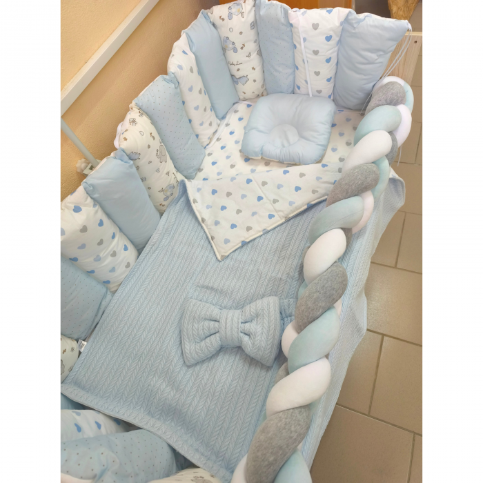 Setul de lenjerie de pat pentru pătuț Pampy este garanția unui somn adânc și dulce pentru micuțul dumneavoastră! Iată de ce: Hipoalergenic: lenjeria de pat pentru pătuț PAMPY este confecționată din 100% bumbac, astfel încât nu provoacă alergii. Holofibra, folosită ca umplutură pentru plapumă, este, de asemenea, un material hipoalergenic. Rezistență la uzură: pentru confecționarea lenjeriei folosim pânză de bumbac foarte rezistentă - ranfors, care își păstrează culoarea și forma chiar și după numeroase spălări. Universalitate: setul de lenjerie de pat constă din 5 piese de bază și conține tot ce este necesar pentru bebeluș din primele zile de viață. Acest set de lenjerie de pat este ideal pentru un cadou nou-născutului și părinților săi. Funcționalitatea detaliilor: cearșaful din set este prevăzut cu elastic, ceea ce permite o aplicare și îndepărtare ușoară. Protecțiile laterale (bumperul) protejează bebelușul de frig și curenți de aer. Setul de lenjerie de pat PAMPY include: Borduri de protecție (bumper) pentru 3 laturi ale pătuțului Plapumă de dimensiunea 100*80 cm Față de pilotă cu fermoar ascuns Cearșaf cu elastic de dimensiunea 120*60 cm Pernă ortopedică Codita Material principal: 100% bumbac ranforce.