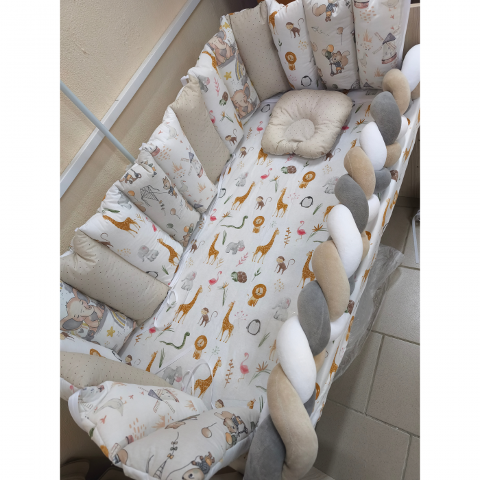 Setul de lenjerie de pat pentru pătuț Pampy este garanția unui somn adânc și dulce pentru micuțul dumneavoastră! Iată de ce: Hipoalergenic: lenjeria de pat pentru pătuț PAMPY este confecționată din 100% bumbac, astfel încât nu provoacă alergii. Holofibra, folosită ca umplutură pentru plapumă, este, de asemenea, un material hipoalergenic. Rezistență la uzură: pentru confecționarea lenjeriei folosim pânză de bumbac foarte rezistentă - ranfors, care își păstrează culoarea și forma chiar și după numeroase spălări. Universalitate: setul de lenjerie de pat constă din 5 piese de bază și conține tot ce este necesar pentru bebeluș din primele zile de viață. Acest set de lenjerie de pat este ideal pentru un cadou nou-născutului și părinților săi. Funcționalitatea detaliilor: cearșaful din set este prevăzut cu elastic, ceea ce permite o aplicare și îndepărtare ușoară. Protecțiile laterale (bumperul) protejează bebelușul de frig și curenți de aer. Setul de lenjerie de pat PAMPY include: Borduri de protecție (bumper) pentru 3 laturi ale pătuțului Cearșaf cu elastic de dimensiunea 120*60 cm Pernă ortopedică Codita Material principal: 100% bumbac ranforce.