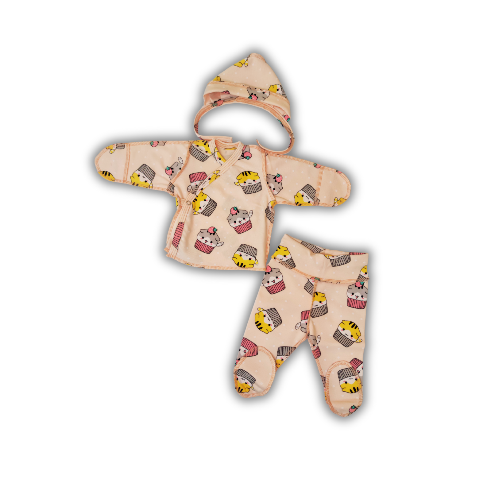 Set de bază Pampy pentru nou-născuți, confecționat din bumbac 100% interlock penye. Include bluză cu mănuși anti-zgâriere, pantalonași și căciuliță cu șireturi – ideal pentru orice anotimp și perfect pentru pielea delicată a bebelușului.