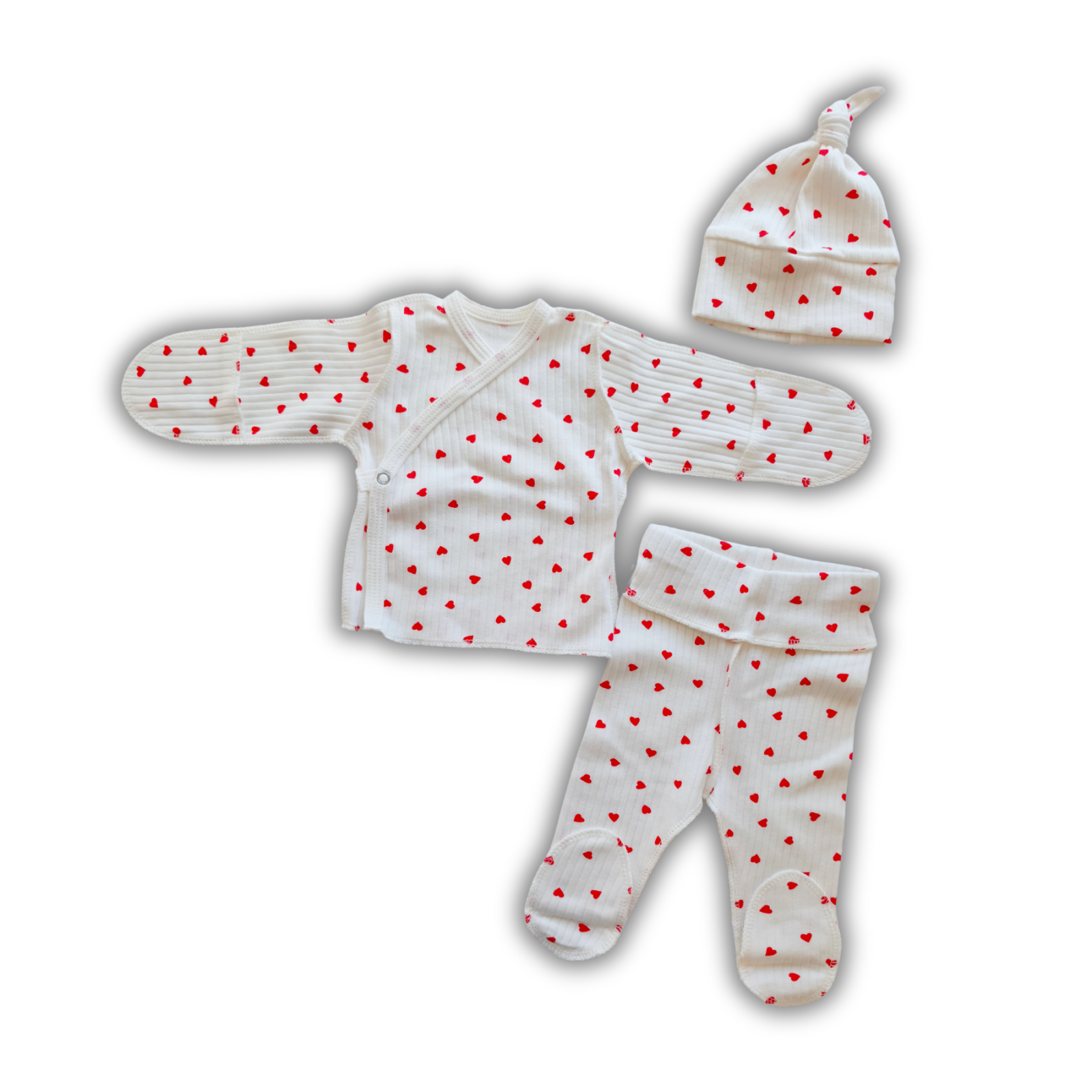 Set Pampy 3 piese din bumbac rib  – cămașă, pantalonași și căciuliță cu nod. Moale, confortabil și perfect pentru bebeluși.
