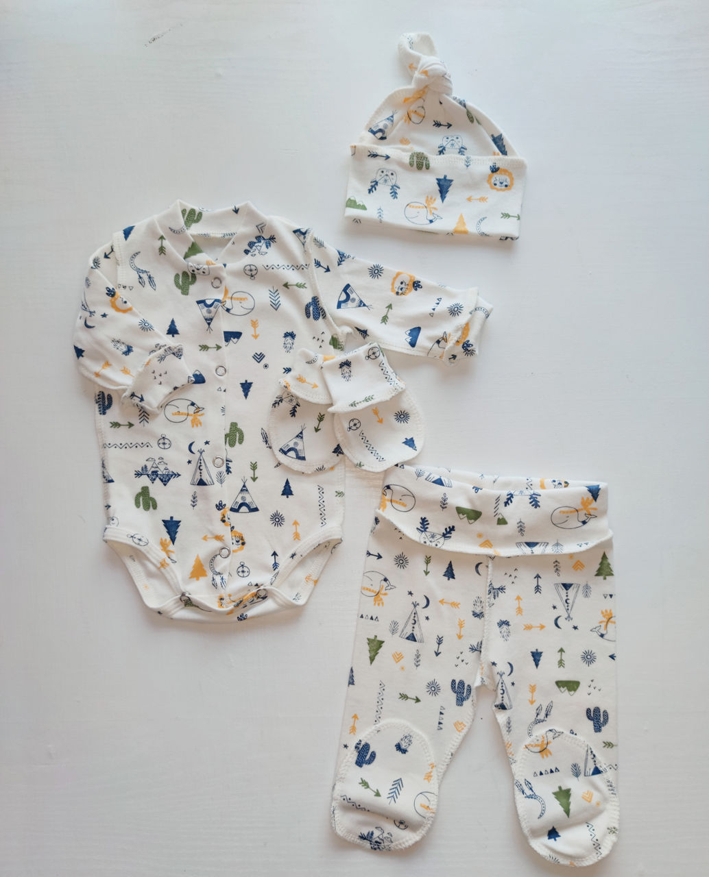 Set din 4 pieseSetul include:Body Cu Maneci LungiPantolanasiCaciulita ManusiSetul este realizat din pânză naturală de înaltă calitate "Interlock". În acest set de haine, copilul va fi foarte confortabil. Deoarece este un material natural, acesta permite aerului și permite pielii să respire.