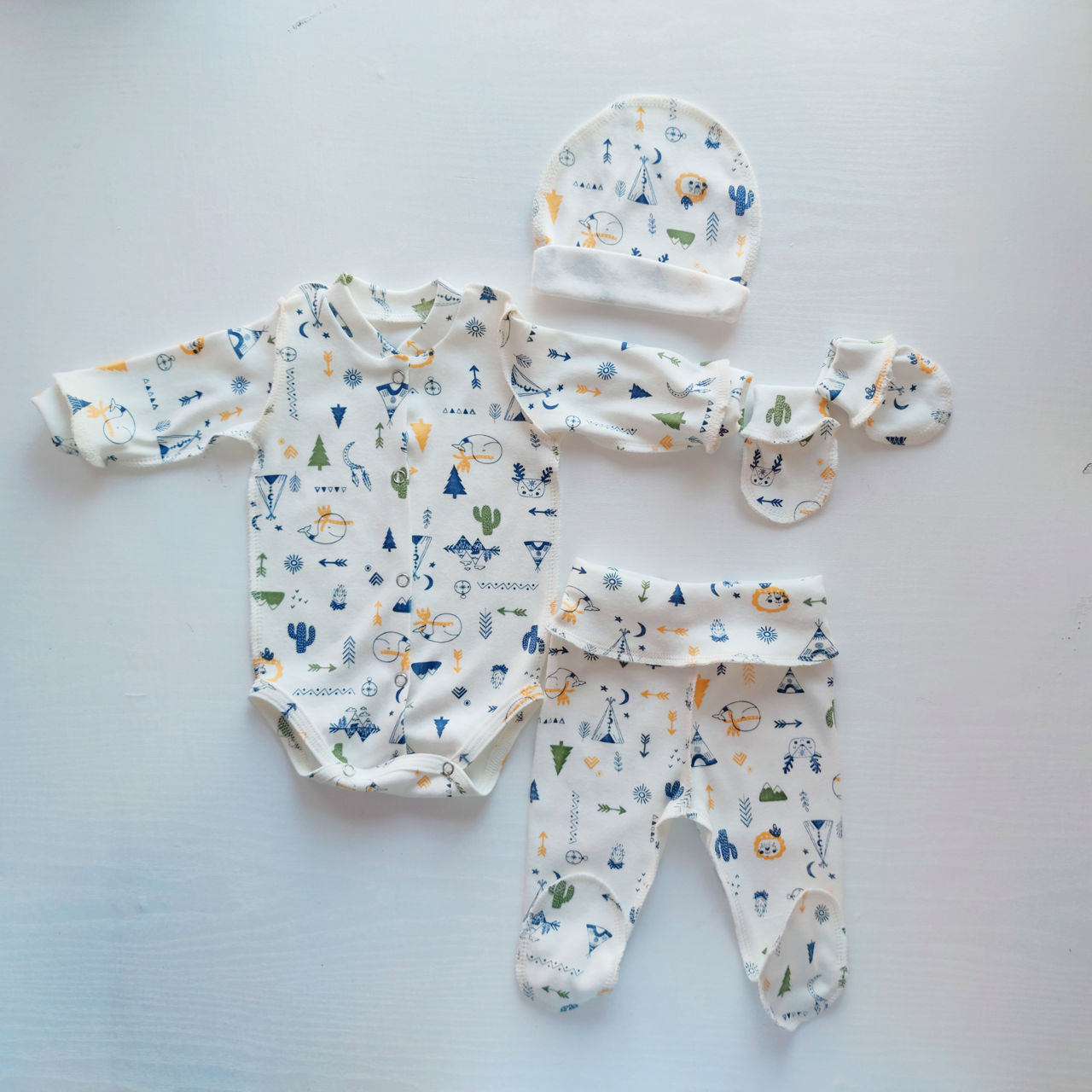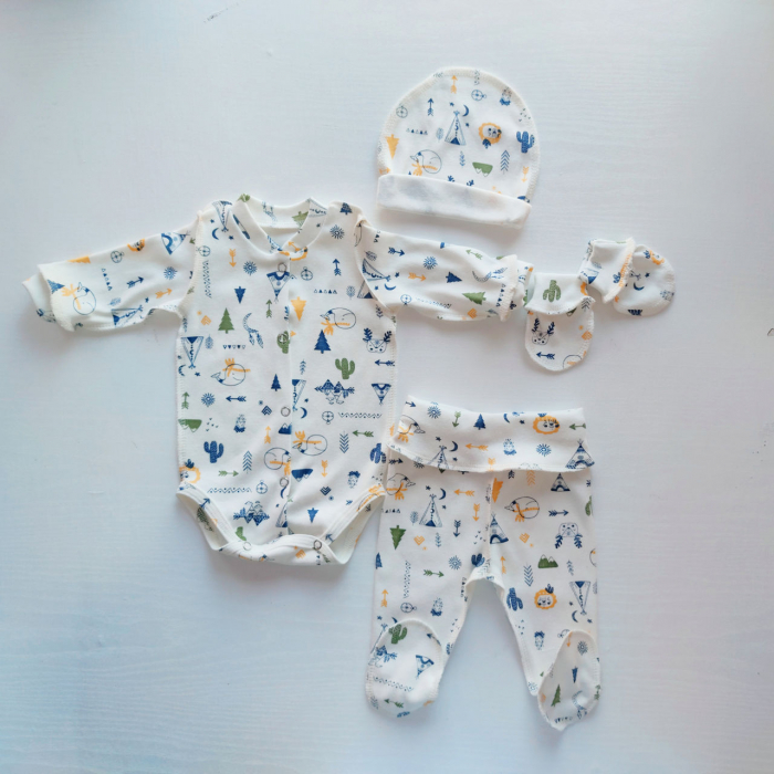 Set de coroane din 4 pieseSetul include:Body Cu Maneci LungiPantolanasiCaciulita ManusiSetul este realizat din pânză naturală de înaltă calitate "Interlock". În acest set de haine, copilul va fi foarte confortabil. Deoarece este un material natural, acesta permite aerului și permite pielii să respire.