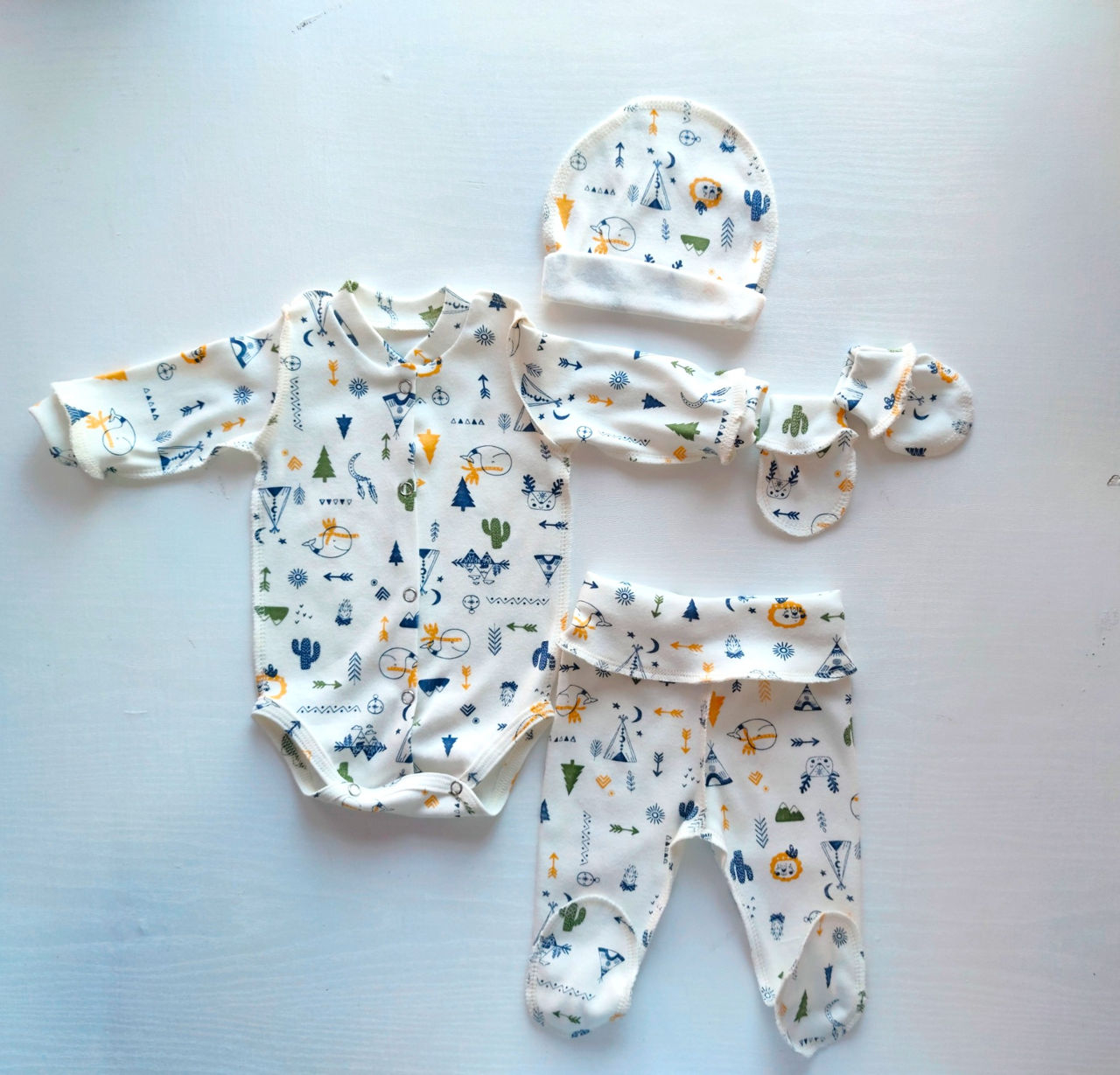 Set de coroane din 4 pieseSetul include:Body Cu Maneci LungiPantolanasiCaciulita ManusiSetul este realizat din pânză naturală de înaltă calitate "Interlock". În acest set de haine, copilul va fi foarte confortabil. Deoarece este un material natural, acesta permite aerului și permite pielii să respire.